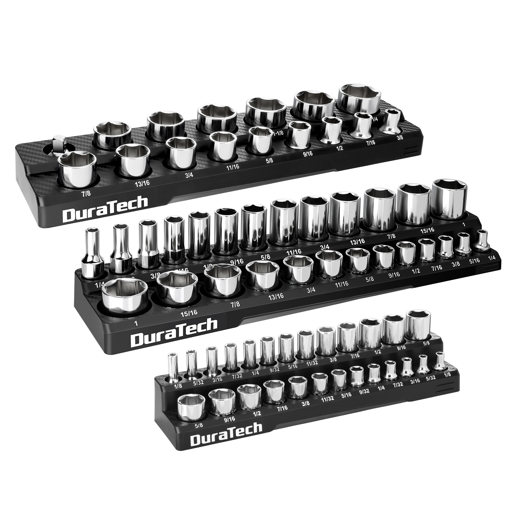 Greater Magnetic Force: The magnetic strip of DURATECH socket organizer set has enough magnetic force to keep stable and avoid damage caused by falling. Edge wrapping design protects magnetic strip from breaking off. This socket holder set can be placed in tool box drawer or attached to the side of the tool cart.