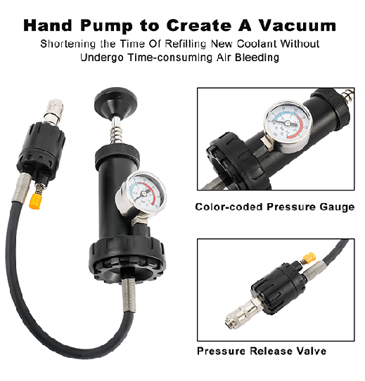 The radiator pressure tester and pump-style cooling system kit makes it simple to check for leaks in the radiator system and quickly replace coolant, saving both time and effort.