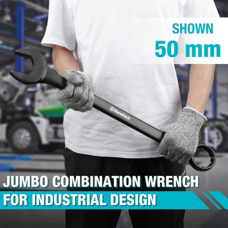 Combination Versatility: Jumbo Combination Wrench Set with open and box end. Open end grips tightly onto fasteners for easy turning and comes equipped with 12 point box end to reach narrow spaces