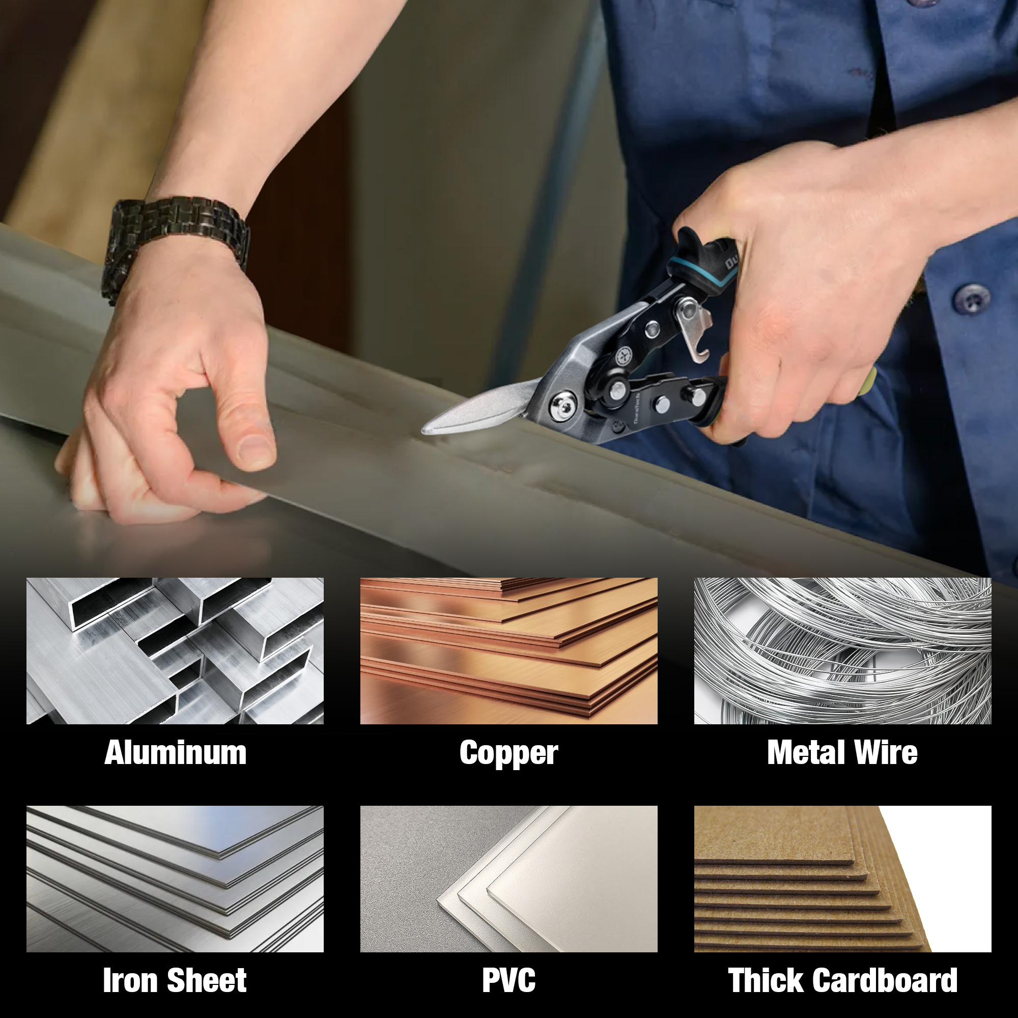 Wide Application- The tin snips are perfect for cutting various materials, such as metal sheets, thin PVC pipes, square steel pipes, keel, and more. They boast exceptional cutting power and can easily slice through 18 gauge (1.2mm) cold rolled steel 18 gauge (1.2mm) galvanized steel and 22 gauge (0.8mm) stainless steel