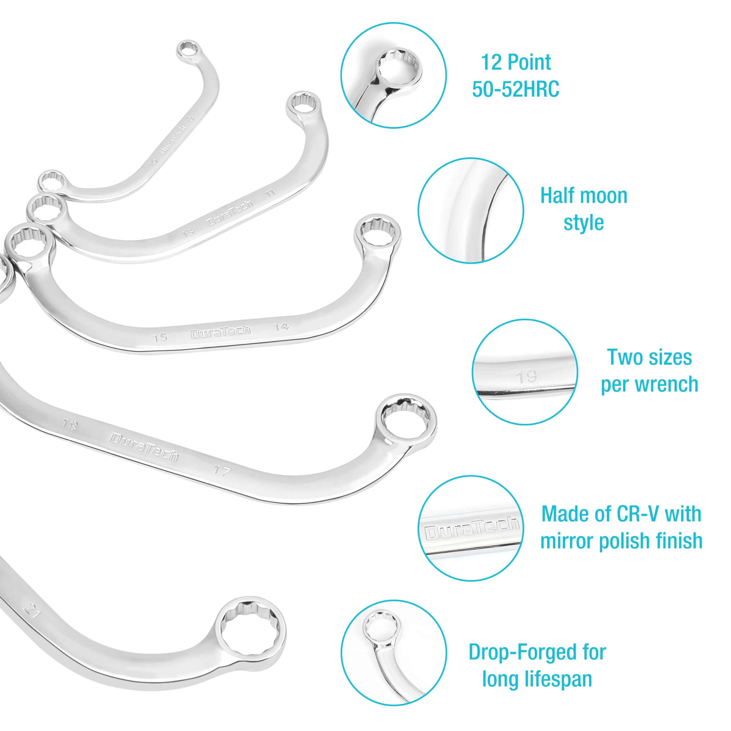 Half Moon Style: The half moon shape wrenches with curved design for maximum access in confined areas, such as the mounting or dismounting parts in an automobile engine or in machinery, making your work more effortless